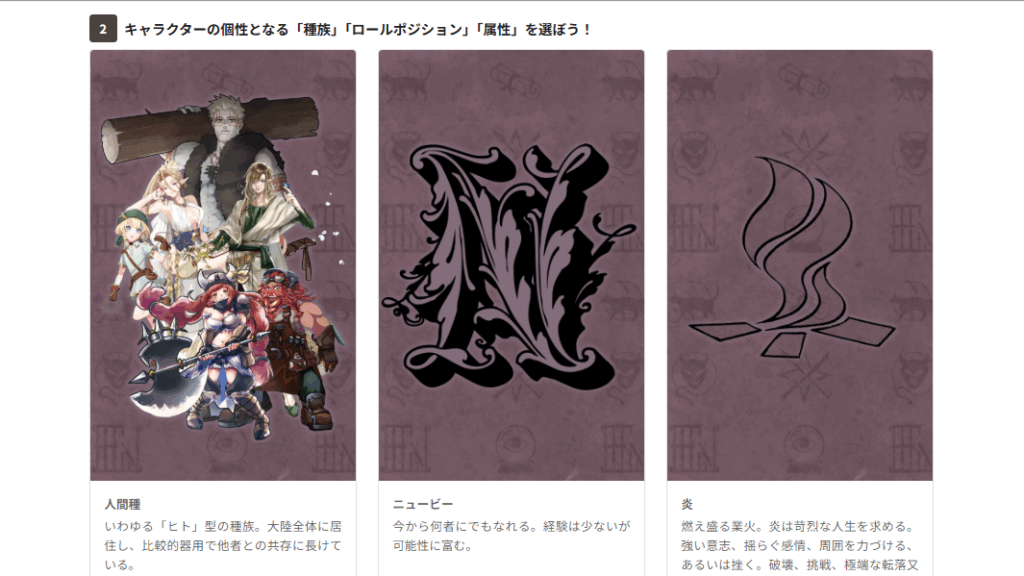 プレイヤーキャラクター(PC)は種族や職業を選択し、最大3つの職業スキルを組み合わせて独自の戦術や個性を構築可能。種族や職業はベースとなるものがあるが、「オリジナル化」機能で独自の種族の設定をすることもできる。個々人の経歴を示す「エピソードスキル」により、高い自由度で創作を行うことができるとともに、スキルにより能力に裏付けを持たせることができる。