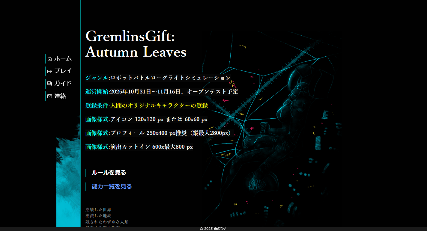 Autumn Leaves』は、人型兵器(ロボット)に搭乗する傭兵となり、スモールステップでミッションをクリアしていくブラウザゲーム。パーツを組み合わせて自分好みの機体を作り、ミッションしてキャラクターを強化していく。1回のミッションのゲーム内所要時間はわずか数秒から数十秒程度で、1回のプレイ時間はゲーム内時間で360秒で完結する。