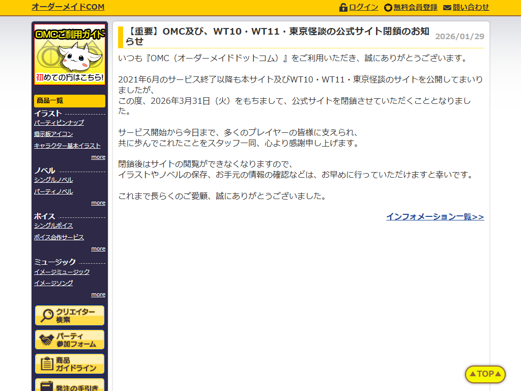 以下に、フロンティアワークスが運営するコンテンツのポータルサイト『t-on』(https://t-on.jp/)に1月29日に掲載されたお知らせ「【重要】OMC及び、WT10・WT11・東京怪談の公式サイト閉鎖のお知らせ」から引用した文章を示す。