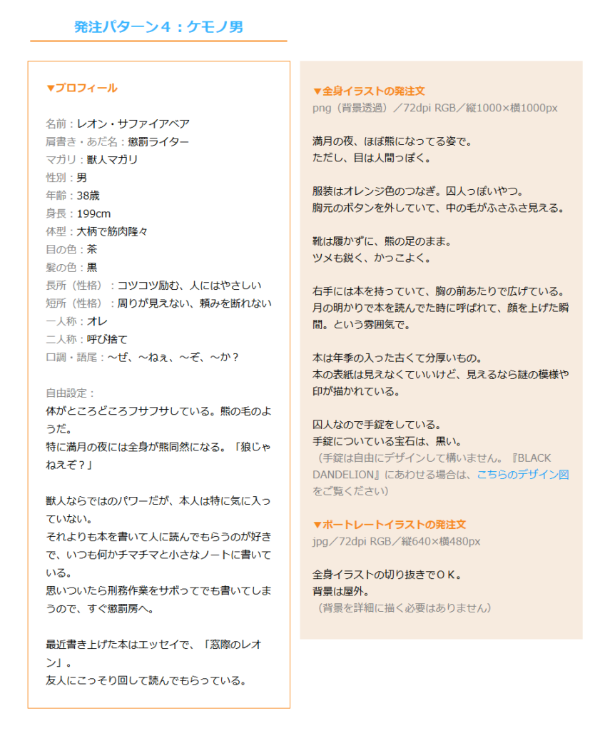 イラストレーター向けにも、イラスト制作の流れとコツを知って、実際に体験してみるお試しコースが用意されている。PBWでの受注の流れ(他のコミッションとの違い)や、どういった種類のイラストがあるか、プロフィールと発注文からイラストを制作する際の注意点等が説明されている。こちらも『BLACK DANDELION』をベースにした実践編[トライアルイラスト]が公開されており、ライター向けの課題同様、公開することが可能で、良かったらハッシュタグ「#PBWトライアル」を付けて欲しいとしている。
