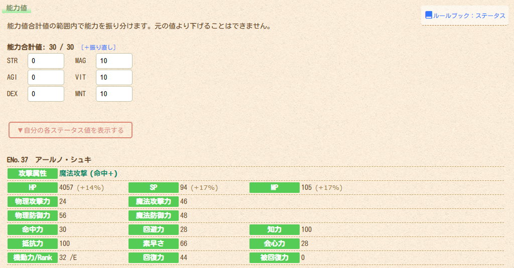 ルールブックのステータスの項目を見たり、他のキャラクターがどんな風に能力値を振っているかを参考にすると良いと思います。