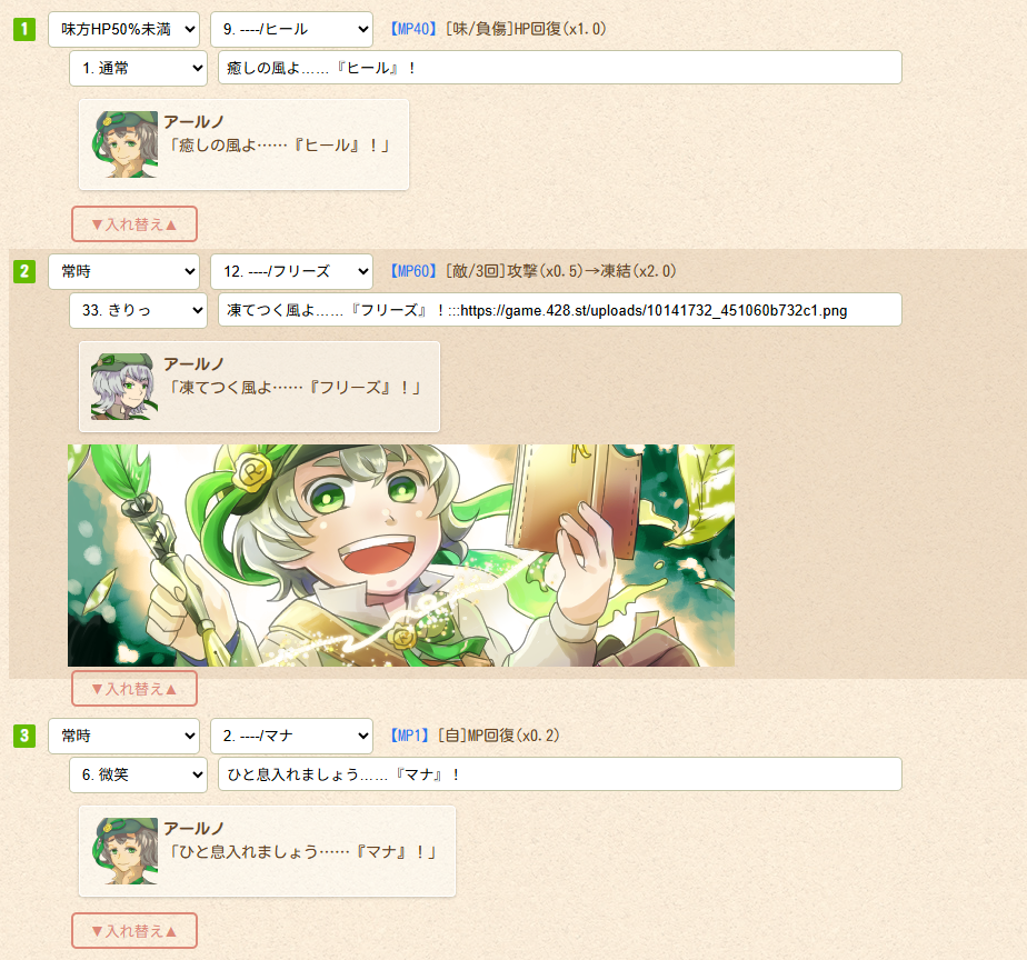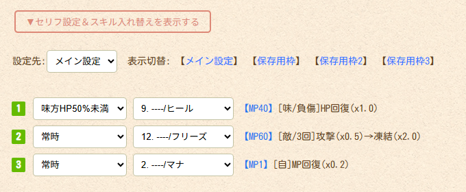 不殺の誓いを立てているのでもなければ、とりあえず、「常時」条件で「攻撃」と書かれているスキルをセットしておきましょう。そして物理系の場合注意したいのが、SPが無くなってもSPを消費するスキルは使用可能で、代わりにHPが減ります。「4行動毎」に「レスト」(自身のSPを回復する)を使用する等、自分でピンチに陥らないように注意しましょう。MPが足りない場合にはスキルは発動しませんので、「常時」で設定した攻撃スキルの下の欄に「マナ」(自身のMPを回復する)を入れておけば良いかと思います。