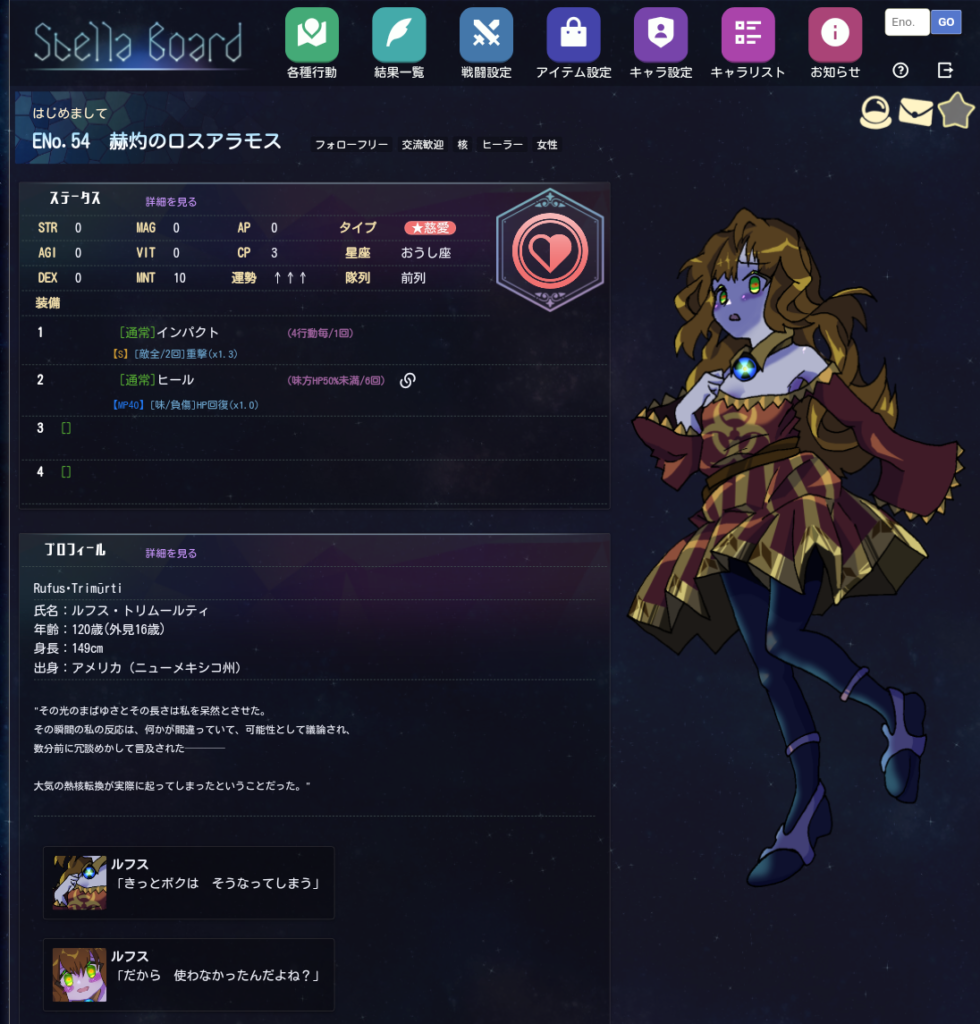 「ひとこと」や「プロフィール」は、キャラ一覧から他の人がどんなことを書いているかを参考にしてみるのも良いでしょう。